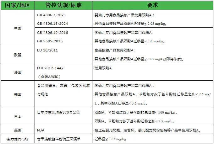 The European Union has passed Regulation (EU) 2024/3190 (effective from January 20, 2025) prohibiting or restricting the use of various bisphenol substances in food contact materials, including: